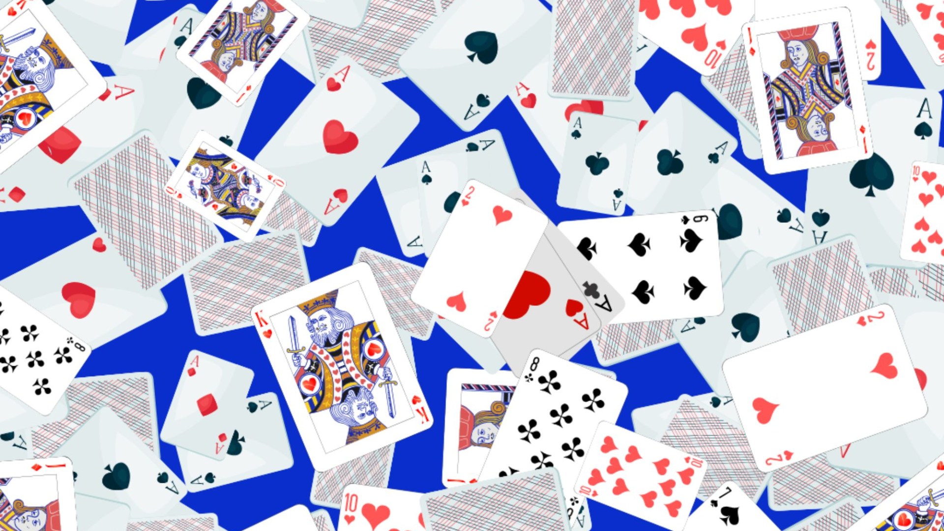 Illustration of many playing cards scattered on a blue background.