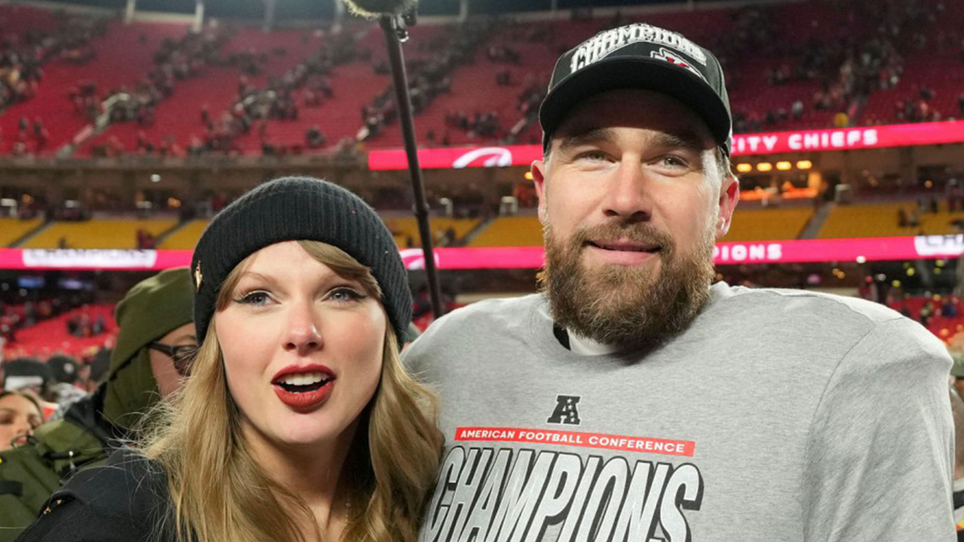 Taylor Swift and Travis Kelce at a football game.