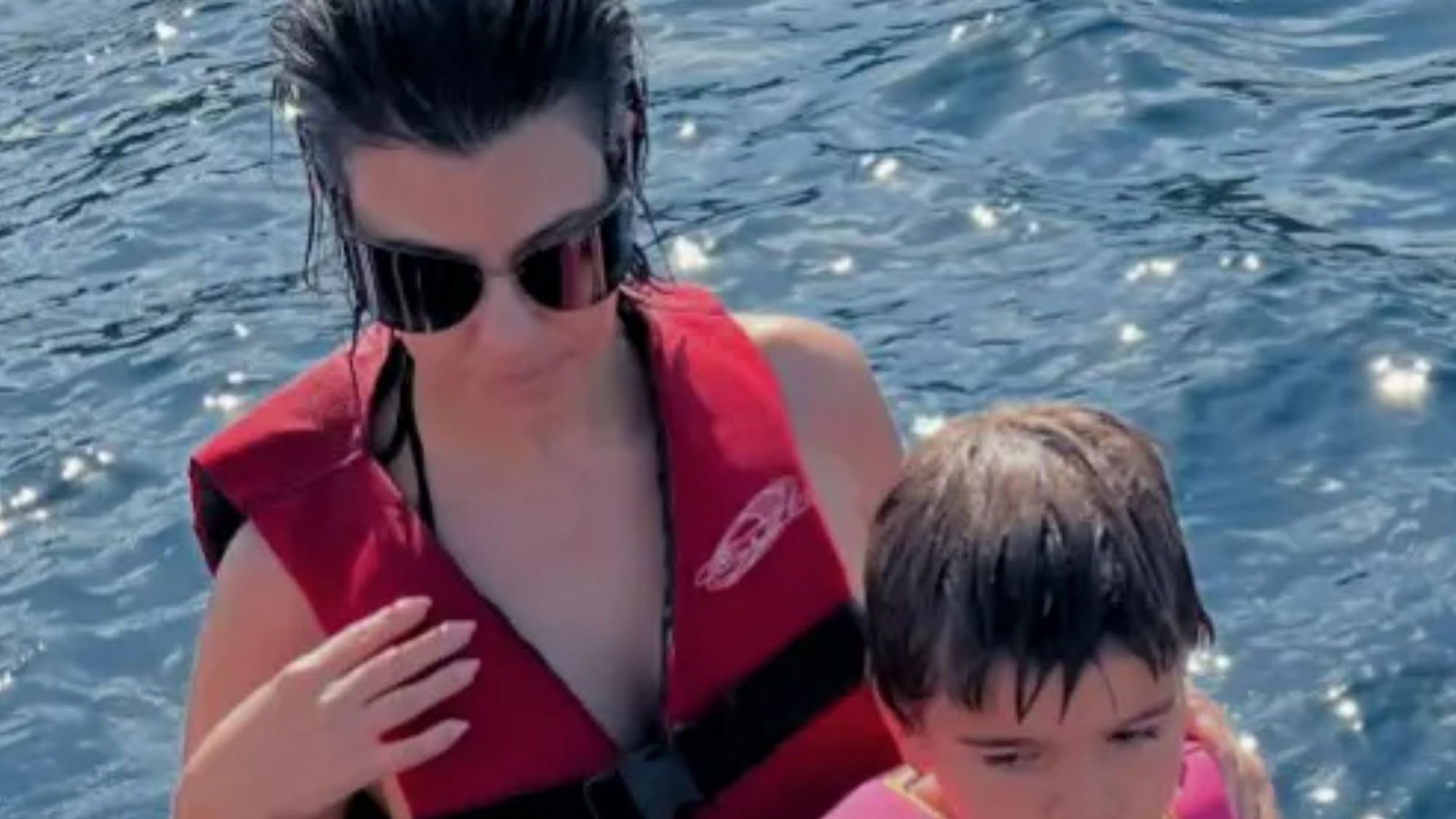 In a single clip Kourtney holds palms with Travis and Reign and takes a operating leap off the again of their yacht right into a lake.