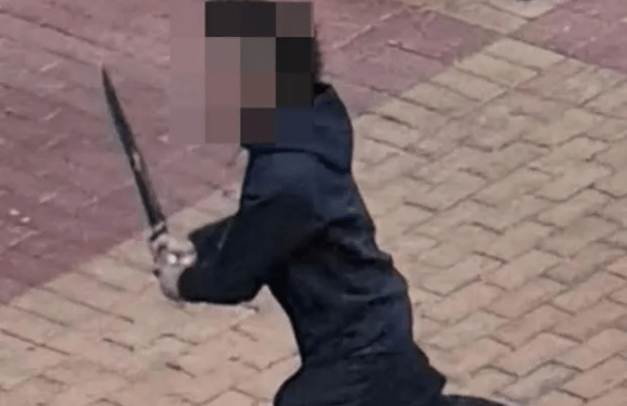 Surprising pictures confirmed a person carrying a large machete, in regards to the size of his personal arm, and threatening one other two individuals with it.