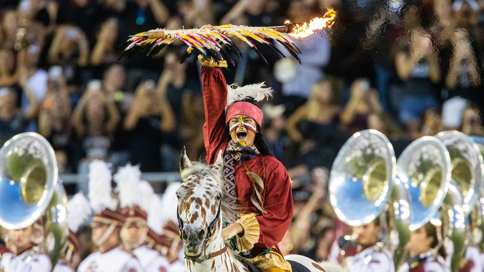With Florida State’s well-known struggle chant echoing from the bleachers and Seminoles gamers holding their helmets excessive, Chief Osceola directs Renegade towards midfield whereas carrying a flaming spear. Renegade, a speckled Appaloosa horse, pauses on the Seminoles brand and rears its entrance legs, positioning Osceola to thrust the 8-foot, garnet-and-gold-feathered spear into the bottom.