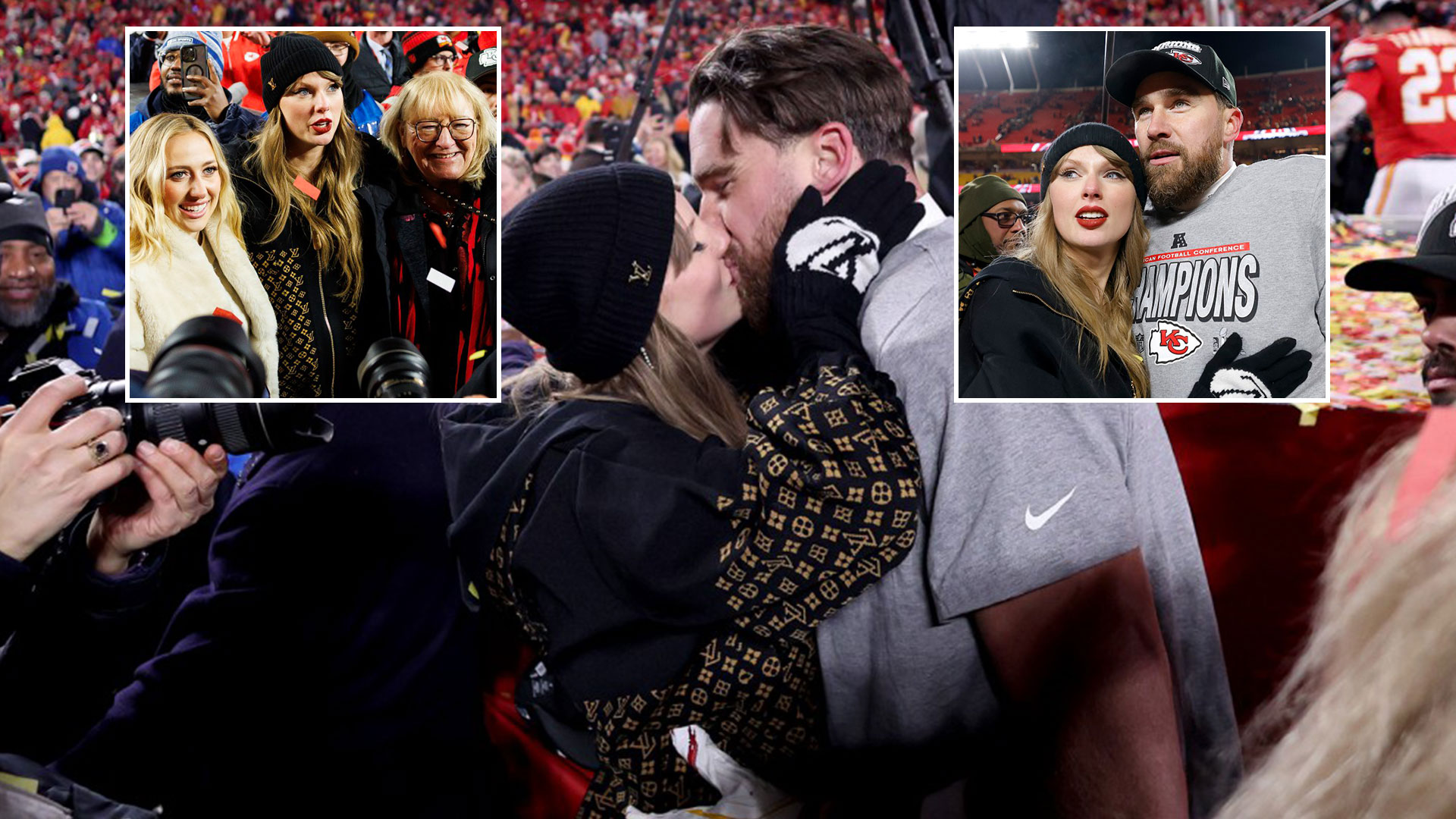 Sports Jan 27 2025 Travis Kelce and Taylor Swift have fun with passionate kiss on subject as Kansas Metropolis Chiefs win sends them to Tremendous Bowl Read More